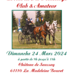 Etriers Bretoncelles et les Ecuries du sagittaire organisent un Concours d’Attelage Club et Amateur le dimanche 24 mars, de 9h à 18h au Château de Saussay à La Madeleine-Bouvet. L’entrée est gratuite, buvette et restauration seront proposées sur place. Renseignements au 06.02.15.68.23 ou 06.08.99.60.03